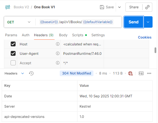We check the If-None-Match header that comes with the request. This header tells the user which version of their cache is available. If this value matches the ETag we created, we know the data hasn’t changed. In this case, there’s no need to retrieve data from the database again, and we return a 304 Not Modified. In other words, we’re telling the user, “The data in your cache is still up-to-date; you can continue using it.”